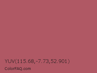 YUV 115.68,-7.73,52.901 Color is a normal red color and the nearest color is Deep Puce #a95c68. Hex code #b05864 and RGB value is rgb(176,88,100). In RGB color space, this color is composed of 69% red, 35% green, 39% blue, In CMYK color space, this color is composed of 0% cyan, 50% magenta, 43% yellow , 31% black , In HSL color space, this color has a hue angle of 352° , 36% saturation and 52% lightness.