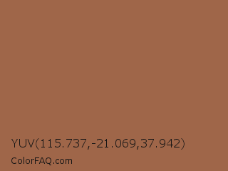 YUV 115.737,-21.069,37.942 Color is a normal orange color and the nearest color is Cape Palliser #a26645. Hex code #9f6649 and RGB value is rgb(159,102,73). In RGB color space, this color is composed of 62% red, 40% green, 29% blue, In CMYK color space, this color is composed of 0% cyan, 36% magenta, 54% yellow , 38% black , In HSL color space, this color has a hue angle of 20° , 37% saturation and 45% lightness.