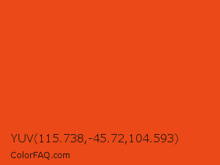 YUV 115.738,-45.72,104.593 Color is a normal red color and the nearest color is Pomegranate #f34723. Hex code #eb4917 and RGB value is rgb(235,73,23). In RGB color space, this color is composed of 92% red, 29% green, 9% blue, In CMYK color space, this color is composed of 0% cyan, 69% magenta, 90% yellow , 8% black , In HSL color space, this color has a hue angle of 14° , 84% saturation and 51% lightness.
