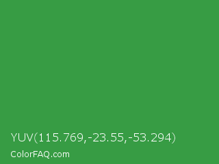 YUV 115.769,-23.55,-53.294 Color is a normal green color and the nearest color is May Green #4c9141. Hex code #379c44 and RGB value is rgb(55,156,68). In RGB color space, this color is composed of 22% red, 61% green, 27% blue, In CMYK color space, this color is composed of 65% cyan, 0% magenta, 56% yellow , 39% black , In HSL color space, this color has a hue angle of 128° , 48% saturation and 41% lightness.
