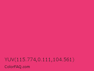 YUV 115.774,0.111,104.561 Color is a normal rose color and the nearest color is Cerise Pink #ec3b83. Hex code #eb3774 and RGB value is rgb(235,55,116). In RGB color space, this color is composed of 92% red, 22% green, 45% blue, In CMYK color space, this color is composed of 0% cyan, 77% magenta, 51% yellow , 8% black , In HSL color space, this color has a hue angle of 340° , 82% saturation and 57% lightness.