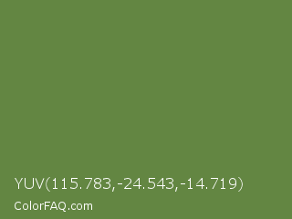 YUV 115.783,-24.543,-14.719 Color is a normal green color and the nearest color is Dingley #5d7747. Hex code #638642 and RGB value is rgb(99,134,66). In RGB color space, this color is composed of 39% red, 53% green, 26% blue, In CMYK color space, this color is composed of 26% cyan, 0% magenta, 51% yellow , 47% black , In HSL color space, this color has a hue angle of 91° , 34% saturation and 39% lightness.