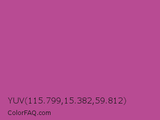 YUV 115.799,15.382,59.812 Color is a normal magenta color and the nearest color is Mulberry #c54b8c. Hex code #b84b93 and RGB value is rgb(184,75,147). In RGB color space, this color is composed of 72% red, 29% green, 58% blue, In CMYK color space, this color is composed of 0% cyan, 59% magenta, 20% yellow , 28% black , In HSL color space, this color has a hue angle of 320° , 43% saturation and 51% lightness.