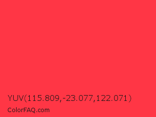 YUV 115.809,-23.077,122.071 Color is a light red color and the nearest color is Red Salsa #fd3a4a. Hex code #ff3645 and RGB value is rgb(255,54,69). In RGB color space, this color is composed of 100% red, 21% green, 27% blue, In CMYK color space, this color is composed of 0% cyan, 79% magenta, 73% yellow , 0% black , In HSL color space, this color has a hue angle of 356° , 100% saturation and 61% lightness.