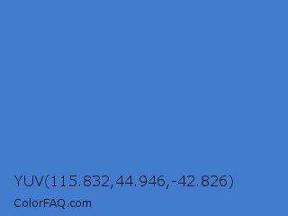 YUV 115.832,44.946,-42.826 Color is a normal blue color and the nearest color is Han Blue #446ccf. Hex code #437bcf and RGB value is rgb(67,123,207). In RGB color space, this color is composed of 26% red, 48% green, 81% blue, In CMYK color space, this color is composed of 68% cyan, 41% magenta, 0% yellow , 19% black , In HSL color space, this color has a hue angle of 216° , 59% saturation and 54% lightness.