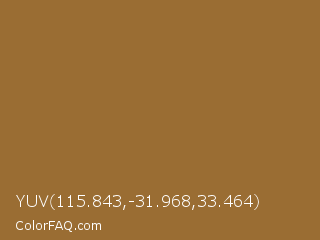 YUV 115.843,-31.968,33.464 Color is a normal orange color and the nearest color is Metallic Sunburst #9c7c38. Hex code #9a6d33 and RGB value is rgb(154,109,51). In RGB color space, this color is composed of 60% red, 43% green, 20% blue, In CMYK color space, this color is composed of 0% cyan, 29% magenta, 67% yellow , 40% black , In HSL color space, this color has a hue angle of 34° , 50% saturation and 40% lightness.