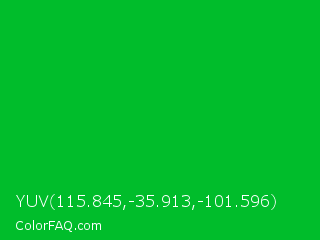 YUV 115.845,-35.913,-101.596 Color is a normal green color and the nearest color is Vivid Malachite #00cc33. Hex code #00bd2b and RGB value is rgb(0,189,43). In RGB color space, this color is composed of 0% red, 74% green, 17% blue, In CMYK color space, this color is composed of 100% cyan, 0% magenta, 77% yellow , 26% black , In HSL color space, this color has a hue angle of 134° , 100% saturation and 37% lightness.