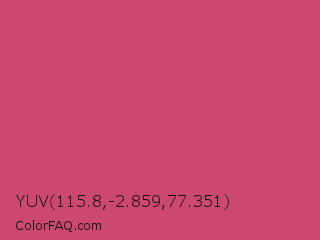 YUV 115.8,-2.859,77.351 Color is a normal rose color and the nearest color is Ruber #ce4676. Hex code #cc486e and RGB value is rgb(204,72,110). In RGB color space, this color is composed of 80% red, 28% green, 43% blue, In CMYK color space, this color is composed of 0% cyan, 65% magenta, 46% yellow , 20% black , In HSL color space, this color has a hue angle of 343° , 56% saturation and 54% lightness.