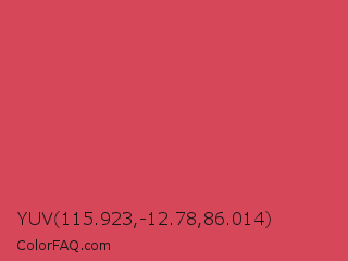 YUV 115.923,-12.78,86.014 Color is a normal red color and the nearest color is Dark Terra Cotta #cc4e5c. Hex code #d6475a and RGB value is rgb(214,71,90). In RGB color space, this color is composed of 84% red, 28% green, 35% blue, In CMYK color space, this color is composed of 0% cyan, 67% magenta, 58% yellow , 16% black , In HSL color space, this color has a hue angle of 352° , 64% saturation and 56% lightness.