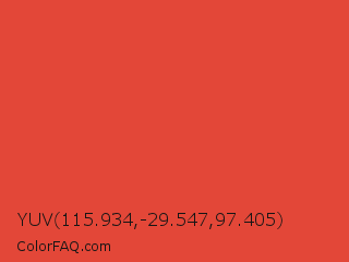 YUV 115.934,-29.547,97.405 Color is a normal red color and the nearest color is Cinnabar #e34234. Hex code #e34738 and RGB value is rgb(227,71,56). In RGB color space, this color is composed of 89% red, 28% green, 22% blue, In CMYK color space, this color is composed of 0% cyan, 69% magenta, 75% yellow , 11% black , In HSL color space, this color has a hue angle of 5° , 75% saturation and 55% lightness.