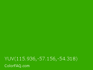 YUV 115.936,-57.156,-54.318 Color is a normal green color and the nearest color is Slimy Green #299617. Hex code #36aa00 and RGB value is rgb(54,170,-0). In RGB color space, this color is composed of 21% red, 67% green, 0% blue, In CMYK color space, this color is composed of 68% cyan, 0% magenta, 100% yellow , 33% black , In HSL color space, this color has a hue angle of 101° , 100% saturation and 33% lightness.