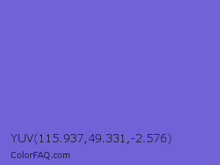 YUV 115.937,49.331,-2.576 Color is a light indigo color and the nearest color is Slate Blue #6a5acd. Hex code #7162d8 and RGB value is rgb(113,98,216). In RGB color space, this color is composed of 44% red, 38% green, 85% blue, In CMYK color space, this color is composed of 48% cyan, 55% magenta, 0% yellow , 15% black , In HSL color space, this color has a hue angle of 248° , 60% saturation and 62% lightness.