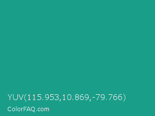 YUV 115.953,10.869,-79.766 Color is a normal cyan color and the nearest color is Niagara #06a189. Hex code #199e8a and RGB value is rgb(25,158,138). In RGB color space, this color is composed of 10% red, 62% green, 54% blue, In CMYK color space, this color is composed of 84% cyan, 0% magenta, 13% yellow , 38% black , In HSL color space, this color has a hue angle of 171° , 73% saturation and 36% lightness.