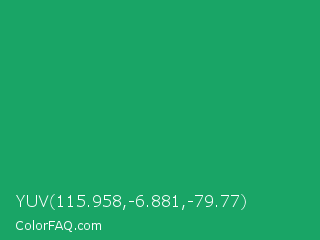 YUV 115.958,-6.881,-79.77 Color is a normal green color and the nearest color is Green Crayola #1cac78. Hex code #19a566 and RGB value is rgb(25,165,102). In RGB color space, this color is composed of 10% red, 65% green, 40% blue, In CMYK color space, this color is composed of 85% cyan, 0% magenta, 38% yellow , 35% black , In HSL color space, this color has a hue angle of 153° , 74% saturation and 37% lightness.