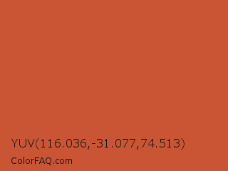 YUV 116.036,-31.077,74.513 Color is a normal red color and the nearest color is Tuscany #bd5e2e. Hex code #c95535 and RGB value is rgb(201,85,53). In RGB color space, this color is composed of 79% red, 33% green, 21% blue, In CMYK color space, this color is composed of 0% cyan, 58% magenta, 74% yellow , 21% black , In HSL color space, this color has a hue angle of 13° , 58% saturation and 50% lightness.
