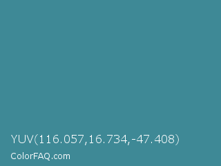 YUV 116.057,16.734,-47.408 Color is a normal cyan color and the nearest color is Astral #327da0. Hex code #3e8996 and RGB value is rgb(62,137,150). In RGB color space, this color is composed of 24% red, 54% green, 59% blue, In CMYK color space, this color is composed of 59% cyan, 9% magenta, 0% yellow , 41% black , In HSL color space, this color has a hue angle of 189° , 42% saturation and 42% lightness.
