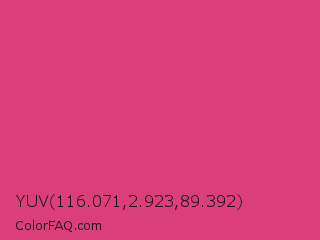 YUV 116.071,2.923,89.392 Color is a normal rose color and the nearest color is Magenta Pantone #d0417e. Hex code #da3f7a and RGB value is rgb(218,63,122). In RGB color space, this color is composed of 85% red, 25% green, 48% blue, In CMYK color space, this color is composed of 0% cyan, 71% magenta, 44% yellow , 15% black , In HSL color space, this color has a hue angle of 337° , 68% saturation and 55% lightness.