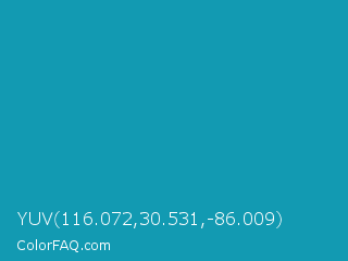 YUV 116.072,30.531,-86.009 Color is a normal cyan color and the nearest color is Blue Green #0d98ba. Hex code #129ab2 and RGB value is rgb(18,154,178). In RGB color space, this color is composed of 7% red, 60% green, 70% blue, In CMYK color space, this color is composed of 90% cyan, 13% magenta, 0% yellow , 30% black , In HSL color space, this color has a hue angle of 189° , 82% saturation and 38% lightness.