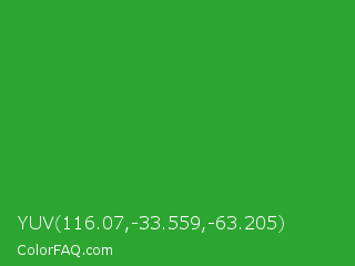 YUV 116.07,-33.559,-63.205 Color is a normal green color and the nearest color is Wageningen Green #34b233. Hex code #2ca630 and RGB value is rgb(44,166,48). In RGB color space, this color is composed of 17% red, 65% green, 19% blue, In CMYK color space, this color is composed of 73% cyan, 0% magenta, 71% yellow , 35% black , In HSL color space, this color has a hue angle of 122° , 58% saturation and 41% lightness.