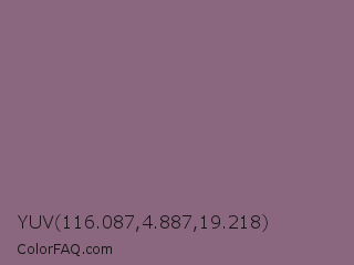 YUV 116.087,4.887,19.218 Color is a normal magenta color and the nearest color is Chinese Violet #856088. Hex code #8a677e and RGB value is rgb(138,103,126). In RGB color space, this color is composed of 54% red, 40% green, 49% blue, In CMYK color space, this color is composed of 0% cyan, 25% magenta, 9% yellow , 46% black , In HSL color space, this color has a hue angle of 321° , 15% saturation and 47% lightness.