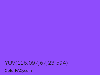YUV 116.097,67,23.594 Color is a light violet color and the nearest color is Navy Purple #9457eb. Hex code #8f4cfc and RGB value is rgb(143,76,252). In RGB color space, this color is composed of 56% red, 30% green, 99% blue, In CMYK color space, this color is composed of 43% cyan, 70% magenta, 0% yellow , 1% black , In HSL color space, this color has a hue angle of 263° , 97% saturation and 64% lightness.