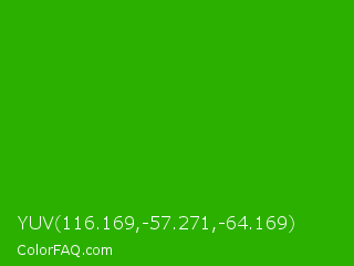 YUV 116.169,-57.271,-64.169 Color is a normal green color and the nearest color is Slimy Green #299617. Hex code #2bb000 and RGB value is rgb(43,176,-0). In RGB color space, this color is composed of 17% red, 69% green, 0% blue, In CMYK color space, this color is composed of 76% cyan, 0% magenta, 100% yellow , 31% black , In HSL color space, this color has a hue angle of 105° , 100% saturation and 35% lightness.