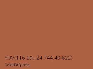 YUV 116.19,-24.744,49.822 Color is a normal orange color and the nearest color is Brown Rust #af593e. Hex code #ad6142 and RGB value is rgb(173,97,66). In RGB color space, this color is composed of 68% red, 38% green, 26% blue, In CMYK color space, this color is composed of 0% cyan, 44% magenta, 62% yellow , 32% black , In HSL color space, this color has a hue angle of 17° , 45% saturation and 47% lightness.