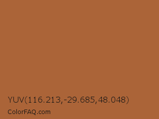 YUV 116.213,-29.685,48.048 Color is a normal orange color and the nearest color is Brown Rust #af593e. Hex code #ab6438 and RGB value is rgb(171,100,56). In RGB color space, this color is composed of 67% red, 39% green, 22% blue, In CMYK color space, this color is composed of 0% cyan, 42% magenta, 67% yellow , 33% black , In HSL color space, this color has a hue angle of 23° , 51% saturation and 45% lightness.