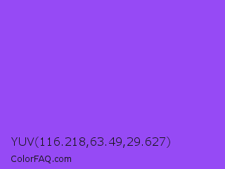 YUV 116.218,63.49,29.627 Color is a light violet color and the nearest color is Navy Purple #9457eb. Hex code #964af5 and RGB value is rgb(150,74,245). In RGB color space, this color is composed of 59% red, 29% green, 96% blue, In CMYK color space, this color is composed of 39% cyan, 70% magenta, 0% yellow , 4% black , In HSL color space, this color has a hue angle of 267° , 90% saturation and 63% lightness.