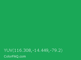 YUV 116.308,-14.449,-79.2 Color is a normal green color and the nearest color is Green Pigment #00a550. Hex code #1aa857 and RGB value is rgb(26,168,87). In RGB color space, this color is composed of 10% red, 66% green, 34% blue, In CMYK color space, this color is composed of 85% cyan, 0% magenta, 48% yellow , 34% black , In HSL color space, this color has a hue angle of 146° , 73% saturation and 38% lightness.