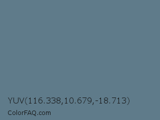 YUV 116.338,10.679,-18.713 Color is a normal blue color and the nearest color is Steel Teal #5f8a8b. Hex code #5f7b8a and RGB value is rgb(95,123,138). In RGB color space, this color is composed of 37% red, 48% green, 54% blue, In CMYK color space, this color is composed of 31% cyan, 11% magenta, 0% yellow , 46% black , In HSL color space, this color has a hue angle of 201° , 18% saturation and 46% lightness.