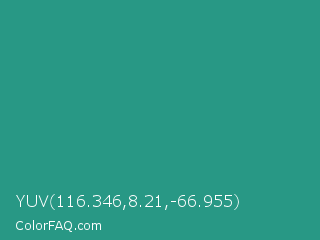 YUV 116.346,8.21,-66.955 Color is a normal cyan color and the nearest color is Lochinvar #2c8c84. Hex code #289885 and RGB value is rgb(40,152,133). In RGB color space, this color is composed of 16% red, 60% green, 52% blue, In CMYK color space, this color is composed of 74% cyan, 0% magenta, 13% yellow , 40% black , In HSL color space, this color has a hue angle of 170° , 58% saturation and 38% lightness.