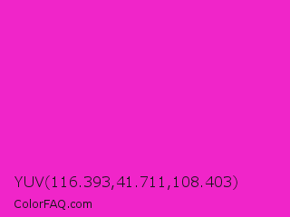 YUV 116.393,41.711,108.403 Color is a normal magenta color and the nearest color is Hot Magenta #ff1dce. Hex code #f025c9 and RGB value is rgb(240,37,201). In RGB color space, this color is composed of 94% red, 15% green, 79% blue, In CMYK color space, this color is composed of 0% cyan, 85% magenta, 16% yellow , 6% black , In HSL color space, this color has a hue angle of 312° , 87% saturation and 54% lightness.