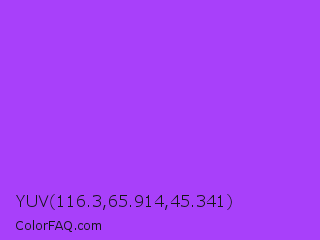 YUV 116.3,65.914,45.341 Color is a light purple color and the nearest color is Navy Purple #9457eb. Hex code #a840fa and RGB value is rgb(168,64,250). In RGB color space, this color is composed of 66% red, 25% green, 98% blue, In CMYK color space, this color is composed of 33% cyan, 74% magenta, 0% yellow , 2% black , In HSL color space, this color has a hue angle of 274° , 95% saturation and 62% lightness.