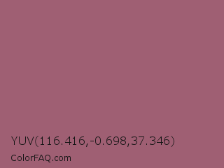 YUV 116.416,-0.698,37.346 Color is a normal rose color and the nearest color is Rose Dust #9e5e6f. Hex code #9f5f73 and RGB value is rgb(159,95,115). In RGB color space, this color is composed of 62% red, 37% green, 45% blue, In CMYK color space, this color is composed of 0% cyan, 40% magenta, 28% yellow , 38% black , In HSL color space, this color has a hue angle of 341° , 25% saturation and 50% lightness.
