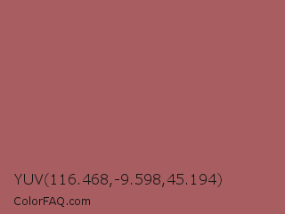YUV 116.468,-9.598,45.194 Color is a normal red color and the nearest color is Deep Puce #a95c68. Hex code #a85e61 and RGB value is rgb(168,94,97). In RGB color space, this color is composed of 66% red, 37% green, 38% blue, In CMYK color space, this color is composed of 0% cyan, 44% magenta, 42% yellow , 34% black , In HSL color space, this color has a hue angle of 358° , 30% saturation and 51% lightness.