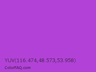 YUV 116.474,48.573,53.958 Color is a normal purple color and the nearest color is Medium Orchid #ba55d3. Hex code #b242d7 and RGB value is rgb(178,66,215). In RGB color space, this color is composed of 70% red, 26% green, 84% blue, In CMYK color space, this color is composed of 17% cyan, 69% magenta, 0% yellow , 16% black , In HSL color space, this color has a hue angle of 285° , 65% saturation and 55% lightness.