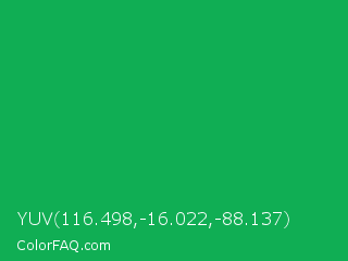 YUV 116.498,-16.022,-88.137 Color is a normal green color and the nearest color is Green Pigment #00a550. Hex code #10ae54 and RGB value is rgb(16,174,84). In RGB color space, this color is composed of 6% red, 68% green, 33% blue, In CMYK color space, this color is composed of 91% cyan, 0% magenta, 52% yellow , 32% black , In HSL color space, this color has a hue angle of 146° , 83% saturation and 37% lightness.