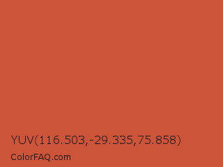 YUV 116.503,-29.335,75.858 Color is a normal red color and the nearest color is Dark Coral #cd5b45. Hex code #cb5439 and RGB value is rgb(203,84,57). In RGB color space, this color is composed of 80% red, 33% green, 22% blue, In CMYK color space, this color is composed of 0% cyan, 59% magenta, 72% yellow , 20% black , In HSL color space, this color has a hue angle of 11° , 58% saturation and 51% lightness.