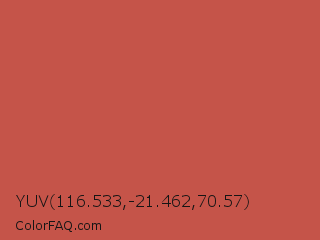 YUV 116.533,-21.462,70.57 Color is a normal red color and the nearest color is Cedar Chest #c95a49. Hex code #c55449 and RGB value is rgb(197,84,73). In RGB color space, this color is composed of 77% red, 33% green, 29% blue, In CMYK color space, this color is composed of 0% cyan, 57% magenta, 63% yellow , 23% black , In HSL color space, this color has a hue angle of 5° , 52% saturation and 53% lightness.