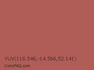 YUV 116.546,-14.566,52.141 Color is a normal red color and the nearest color is Matrix #b05d54. Hex code #b05c57 and RGB value is rgb(176,92,87). In RGB color space, this color is composed of 69% red, 36% green, 34% blue, In CMYK color space, this color is composed of 0% cyan, 48% magenta, 51% yellow , 31% black , In HSL color space, this color has a hue angle of 3° , 36% saturation and 52% lightness.