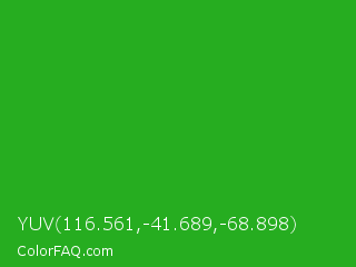 YUV 116.561,-41.689,-68.898 Color is a normal green color and the nearest color is Wageningen Green #34b233. Hex code #26ad20 and RGB value is rgb(38,173,32). In RGB color space, this color is composed of 15% red, 68% green, 13% blue, In CMYK color space, this color is composed of 78% cyan, 0% magenta, 82% yellow , 32% black , In HSL color space, this color has a hue angle of 117° , 69% saturation and 40% lightness.
