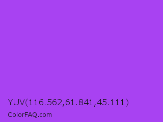 YUV 116.562,61.841,45.111 Color is a normal purple color and the nearest color is Navy Purple #9457eb. Hex code #a842f2 and RGB value is rgb(168,66,242). In RGB color space, this color is composed of 66% red, 26% green, 95% blue, In CMYK color space, this color is composed of 31% cyan, 73% magenta, 0% yellow , 5% black , In HSL color space, this color has a hue angle of 275° , 87% saturation and 60% lightness.