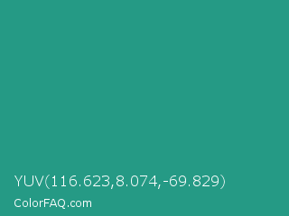 YUV 116.623,8.074,-69.829 Color is a normal cyan color and the nearest color is Lochinvar #2c8c84. Hex code #259a85 and RGB value is rgb(37,154,133). In RGB color space, this color is composed of 15% red, 60% green, 52% blue, In CMYK color space, this color is composed of 76% cyan, 0% magenta, 14% yellow , 40% black , In HSL color space, this color has a hue angle of 169° , 61% saturation and 37% lightness.