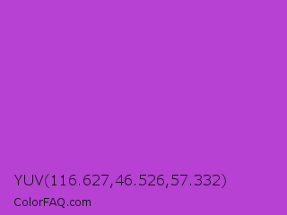 YUV 116.627,46.526,57.332 Color is a normal purple color and the nearest color is Medium Orchid #ba55d3. Hex code #b641d3 and RGB value is rgb(182,65,211). In RGB color space, this color is composed of 71% red, 25% green, 83% blue, In CMYK color space, this color is composed of 14% cyan, 69% magenta, 0% yellow , 17% black , In HSL color space, this color has a hue angle of 288° , 62% saturation and 54% lightness.