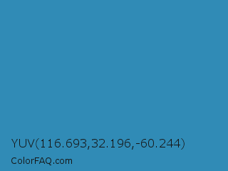 YUV 116.693,32.196,-60.244 Color is a normal blue color and the nearest color is Boston Blue #3b91b4. Hex code #308bb6 and RGB value is rgb(48,139,182). In RGB color space, this color is composed of 19% red, 55% green, 71% blue, In CMYK color space, this color is composed of 74% cyan, 24% magenta, 0% yellow , 29% black , In HSL color space, this color has a hue angle of 199° , 58% saturation and 45% lightness.