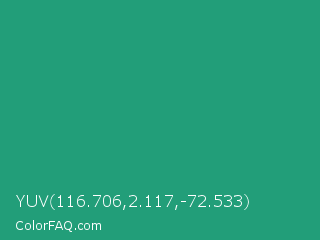 YUV 116.706,2.117,-72.533 Color is a normal green color and the nearest color is Green Crayola #1cac78. Hex code #229e79 and RGB value is rgb(34,158,121). In RGB color space, this color is composed of 13% red, 62% green, 47% blue, In CMYK color space, this color is composed of 78% cyan, 0% magenta, 23% yellow , 38% black , In HSL color space, this color has a hue angle of 162° , 65% saturation and 38% lightness.