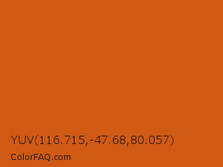 YUV 116.715,-47.68,80.057 Color is a normal orange color and the nearest color is Orange Roughy #c45719. Hex code #d05914 and RGB value is rgb(208,89,20). In RGB color space, this color is composed of 82% red, 35% green, 8% blue, In CMYK color space, this color is composed of 0% cyan, 57% magenta, 90% yellow , 18% black , In HSL color space, this color has a hue angle of 22° , 82% saturation and 45% lightness.