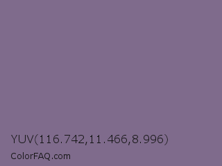 YUV 116.742,11.466,8.996 Color is a normal purple color and the nearest color is Rum #796989. Hex code #7f6b8c and RGB value is rgb(127,107,140). In RGB color space, this color is composed of 50% red, 42% green, 55% blue, In CMYK color space, this color is composed of 9% cyan, 24% magenta, 0% yellow , 45% black , In HSL color space, this color has a hue angle of 276° , 13% saturation and 48% lightness.