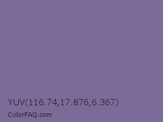 YUV 116.74,17.876,6.367 Color is a normal violet color and the nearest color is Kimberly #736c9f. Hex code #7c6a99 and RGB value is rgb(124,106,153). In RGB color space, this color is composed of 49% red, 42% green, 60% blue, In CMYK color space, this color is composed of 19% cyan, 31% magenta, 0% yellow , 40% black , In HSL color space, this color has a hue angle of 263° , 19% saturation and 51% lightness.